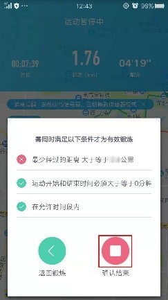 点击“开始锻炼”→“锻炼设置”开启软件权限→ “开始”→ “跑步”→完成运动后,点击“暂停”→ 长按“结束”→“确认结束”(运动数据在有网络的情况下自动上传)。