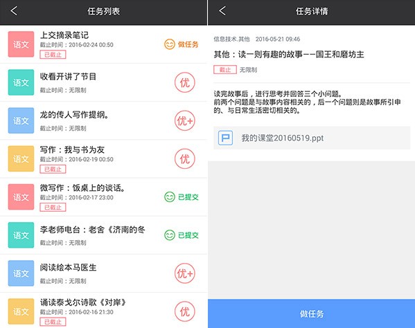 学生可线上做任务、交任务,教学过程中产生的所有数据会全部记录下来,最终生成过程性学习报告,学习报告无论老师还是学生都可时时查看。