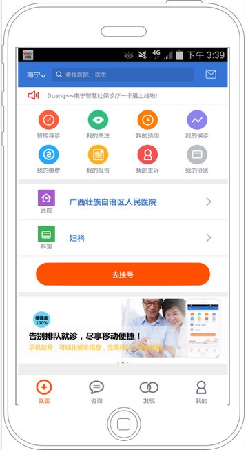 2.南宁市参保群众只要在手机下载该APP并绑定本人社会保障卡后,通过手机即可随时使用门诊预约挂号、候诊查询、医保结算、自助缴费等20多项就医自助服务,