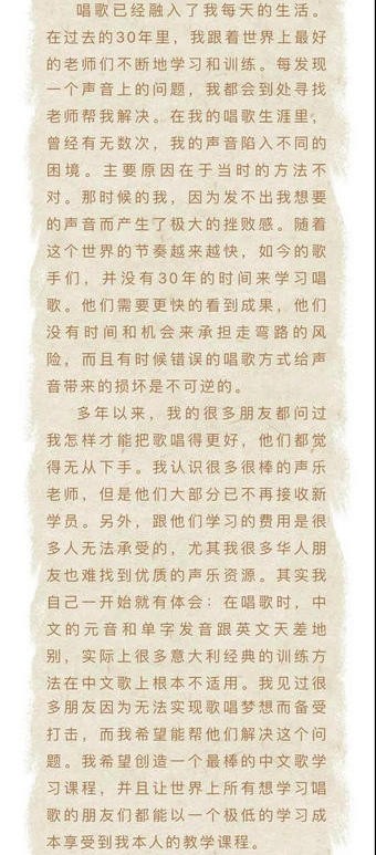 A:王力宏老师在30多年的声乐学习经历中发现“在唱歌时,中文的元音和单子发音跟英文天差地别,实际上很多意大利经典的训练方法在中文歌上根本不适用。”因此他将自己30多年来跟随世界各地音乐名师学习的经验,去芜存菁,汇总成一个30天的,适合中国人的中文歌学习课程,以帮助同学们调整和提升自己的声音。课程除了声乐本身的教学外,还将包括如何选择麦克风、唱歌时如何站立等演唱时实际问题的解答,帮助同学在完成课程学习后可以真正把歌唱得更好。与此同时,发声训练也将帮助同学在演讲等其他需要运用声音感染他人的场合做到更好。