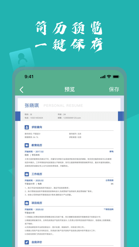 完美简历APP是一款专业、高效、智能的简历工具,提供专业的简历模板,可在手机快捷制作简历,让你的简历更充实更有竞争力。让你的求职效率和成功率妥妥翻倍!