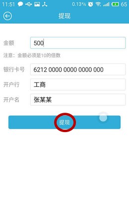 依次输入填现金额(必须是10的倍数)、银行卡号、开户行、开户名, 点击下方提现→提现完成(三个工作日内到账)