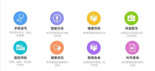 目前已实现手机挂号、排队叫号、取报告单、在线支付、智能导诊、就诊导航、科室医生、健康资讯、健康百科等功能。