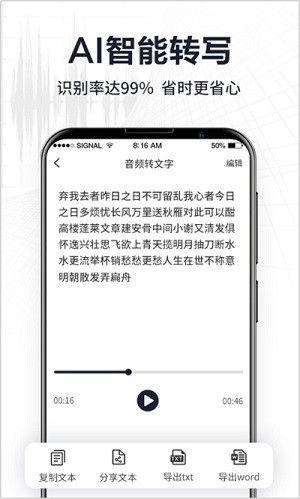 它为您将各种各样来源格式的语音文件转换成简单清晰的文字文本