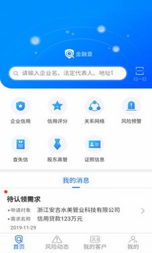v1.0.5【更新内容】本应用提供金融信用信息查询服务,包括风险动态,我的客户,可以查询企业股东高管,风险信息,经营异常信息,失信信息,许可证信息,企业信用评分信息等。 v1.0.4