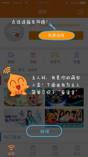 爱宿舍app是一款可以免费连接无线的客户端应用,爱宿舍让您随时随地畅快上网,不用担心流量问题,并且还可以通过完成任务赚取金币,兑换奖励,非常的方便实用,快来下载体验吧!