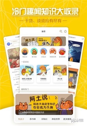 阅陪伴软件还有好玩有趣的动漫形象——阿土,为孩子揭秘身边的科普常识、趣闻知识,让孩子在寓教于乐中茁壮成长!