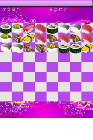 消灭寿司游戏开始后,选择两个相邻的寿司图进行交换后,如果出现三个以上相同寿司图片连成一横线或竖线时会消去并且得分;上方的寿司图依次下落。