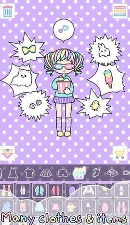 3.一些衣服和物品提供了动画展示效果。使用大量衣服,物品,语音气泡和字母打扮她们,与你的朋友分享你装饰后的漂亮女孩吧!
