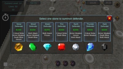 这是一款塔防游戏,您可以召唤7种守卫来攻击敌人。7种守卫具有不同的属性(金、木、水、火、土、雷和暗黑)。