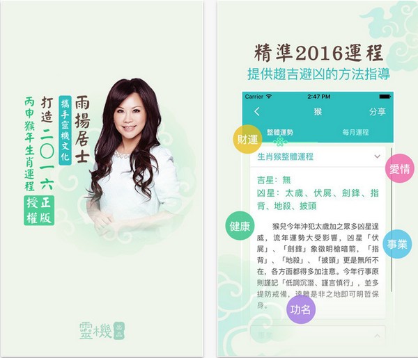 雨扬居士2016生肖运程app是雨扬居士与灵机文化强强合作的2016开运宝典,除了有传统的生肖运程详解之外,还增加了由雨扬居士总结多年经验,并经过改良的独家特色开运方法,助您2016年在财运、事业、爱情等诸多方面行大运、行好运!