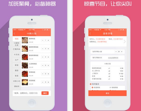 -用户可以在线选择锅底及菜品,并可以方便快捷的在线支付和餐到付款!