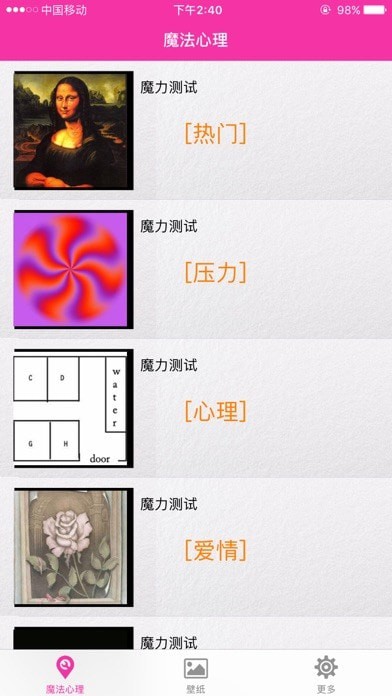 魔法心理测试的图片和题目是基于心理学理论分析和实践测试,来源于心理学的标准测验。共4部分 :压力篇,心理篇,爱情篇,智力篇