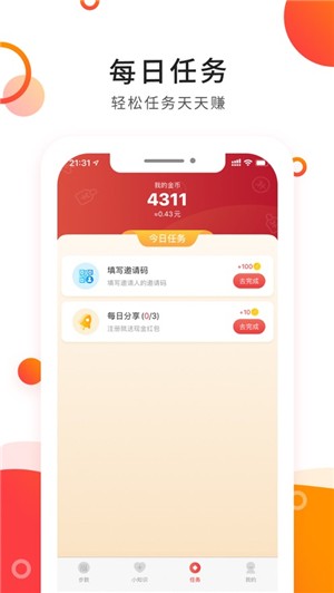 用户通过完成各种各样的任务来赚钱金币、红包。