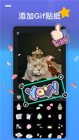- 可以添加贴纸/gif贴纸,为视频打上个性化的标签,添加水印;给不便露脸的小伙伴打上可爱的马赛克……