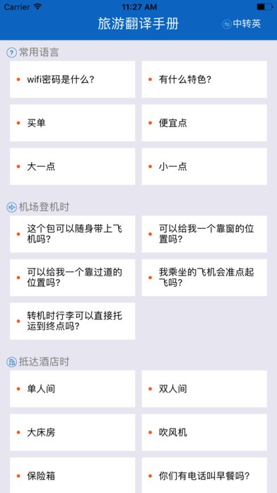 老吕出境游app是一款免费的、支持离线下载的翻译手册,老吕出境游app模仿用户真实出国旅行场景,在机场登机、抵达酒店、外出就餐、问路等必须与人交流的场景中,解决语言沟通上的难题。