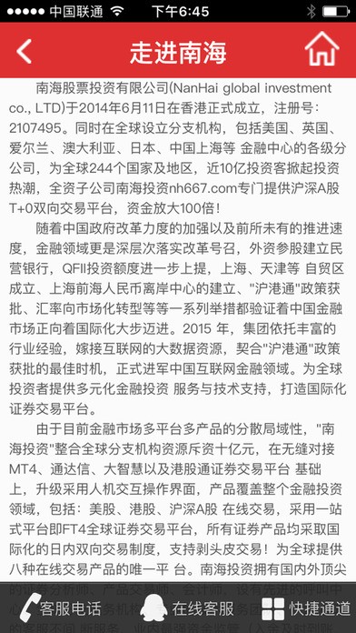 南海股票投资app是一款提供投资服务的手机应用。南海股票投资app主要为广大投资者提供最新的金融投资资讯,理财资讯及在线投资等服务。南海股票投资app是你进行投资的好帮手。