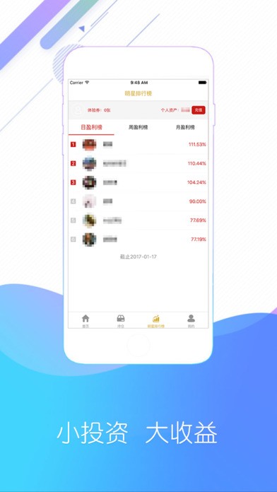 4、微资金。本App的超低门槛,颠覆了整体金融投资行业,通过教育,让理财更加平民化、娱乐化。
