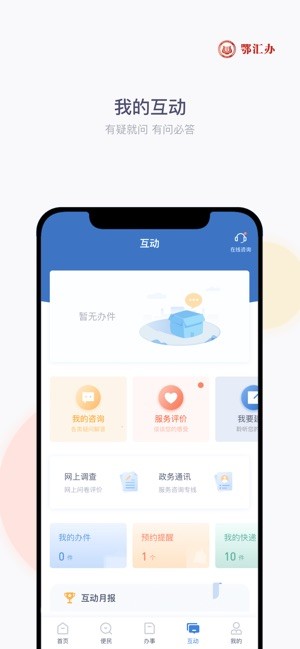 答:在我的个人信息页面,您可以查看所有办件信息、预约提醒、我的收藏等,并可在线向政府工作人员进行咨询、投诉和建议互动。