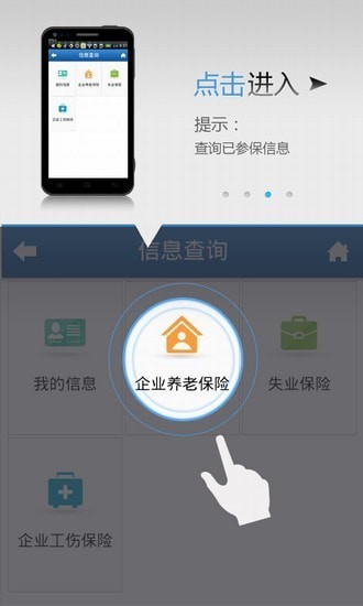 ①首先点击河北人社APP进入首页,选择查询内容的跳转按钮,如下图点击个人信息查询: