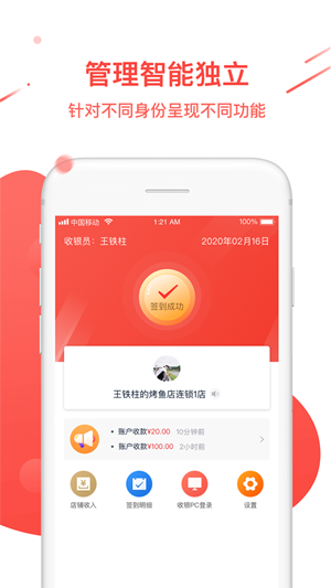 4、可以绑定多个收银员,实现多家店铺同一账户收钱,再也不用担心收银员贪吃拿等情况出现,真正实现了一手握钱;