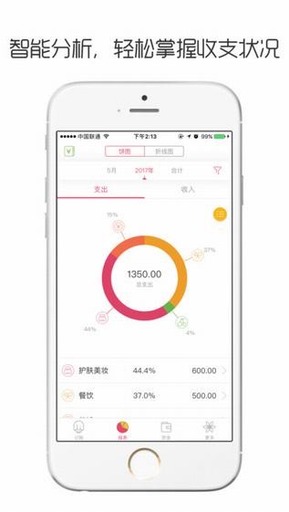 报表分析多维度,饼图看分类收支占比,折线图看收支趋势,更好分析你的财务状况。