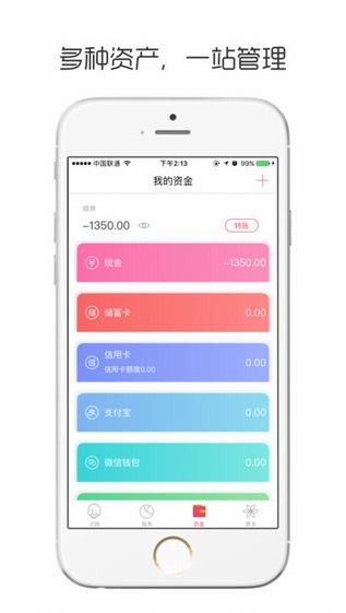 现金、信用卡、支付宝和股票等资金账户一手掌握,为您自动核算每个资金账户的收支,让你的资产管理愈加灵活。