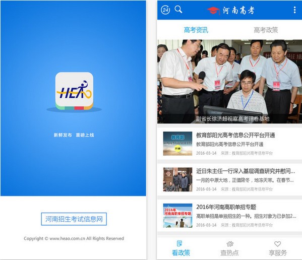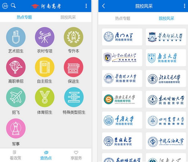 河南高考app设计了3个栏目:看政策、查热点、享服务。打开“看政策”栏目,考生可及时获取省招办发布的高招资讯、招生政策;打开“查热点”栏目,考生可获取关心的焦点热点问题;打开“享服务”栏目,考生可查询高考分数及录取结果,以及高校招生计划、省招办咨询电话和全省各市服务大厅联系方式。