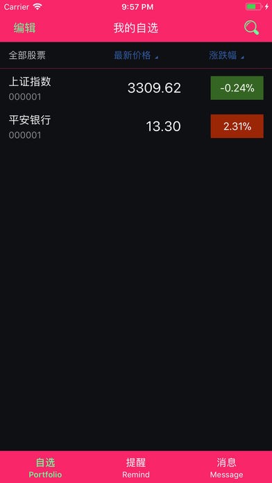 这是一款简约的股票提醒软件,用户能够添加自选股。