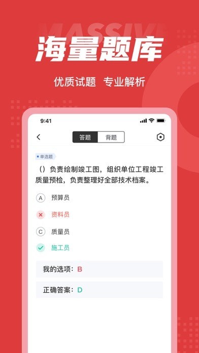 施工员考试聚题库app是一款专为备考施工员的用户打造的题库学习软件,有海量的题库可以进行练习,同时提供试题解析,帮助用户更好地学习,还有历年来的考试题目,感兴趣的朋友快来下载试一试吧!
