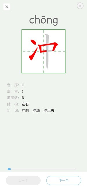 -学习汉字的学习方式可以点击右上角的播放按钮,观看汉字正确的书写过程