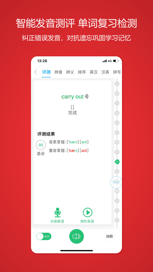 智能测评系统,原文跟读复习评估英语学习效果,实时纠正错误的英语单词发音,实现标准的英语口语发音。