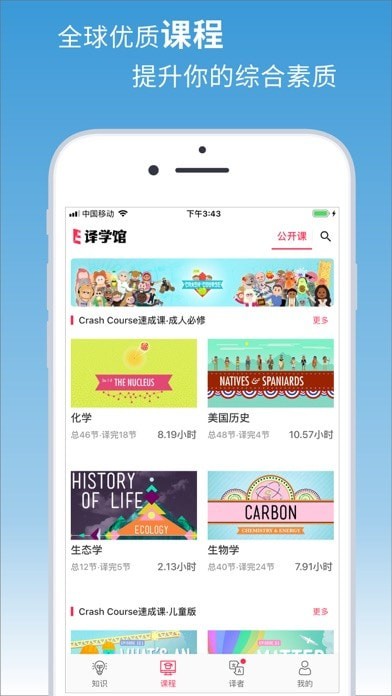 如果一条条碎片化的知识视频不能满足你,你希望有更多系统的学习资料,也没问题,译学馆app集合了海外优质公开课,包括速成班,可汗学院,MIT,哈佛,耶鲁等一流名校的课程,并不断组织译者翻译出更加优质的课程。