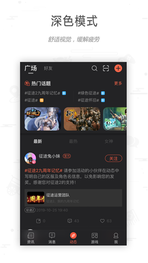 征途大神社区app是一款游戏数据互通的游戏辅助应用,征途大神社区手机版中用户可以看一手游戏动态,获取专属游戏攻略,征途大神社区让你享受精彩游戏服务。