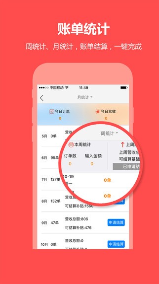 1、财务统计:账单周统计和月统计,订单对账简单明了,申请结算,一键到位。