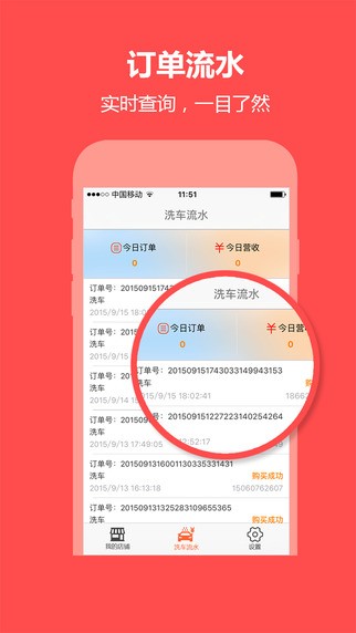 5、洗车流水:实时掌控洗车订单流水动态,一目了然,确保洗车账单准确无误。