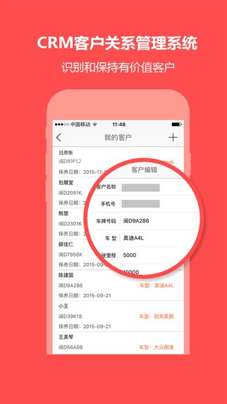 2、CRM客户关系管理:客户管理、工单管理、保单管理、保养管理等客户关系管理,为商家识别和保持有价值的客户。