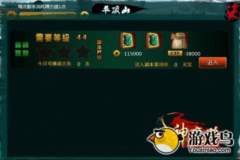 副本是获得游戏经验和游戏道具的主要途径,玩家可通过接取主线任务,再通过任务引导自动寻路进入副本,每进入一次副本消耗1点精力值,副本完成后可获得材料、技能和伙伴魂魄等奖励