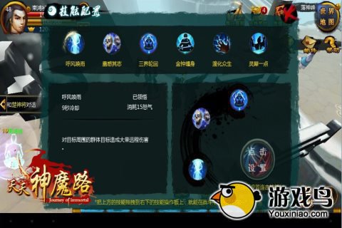游戏角色使用的技能可分为技能配置和普通攻击两种。当角色达到相应等级后,技能会自动激活,激活后的技能需要玩家自行配置到主界面快捷栏内进行使用。普通攻击级和技能攻击的开