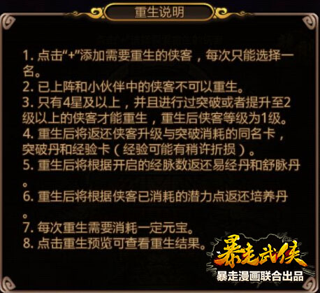 暴走漫画联合出品、梦想手游独代的首款U3D武侠卡牌手游《暴走武侠》,1.2.1版本最新玩法——侠客重生!你试过辛苦培养一个侠客,但遇到更强侠客时,又不舍得曾经付出的突破丹、舒