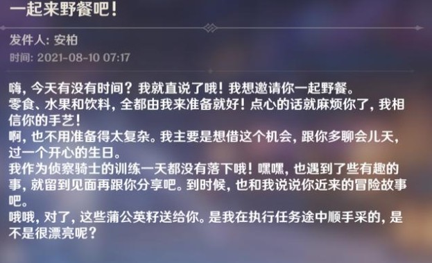 原神安柏生日邮件是一起来野餐吧,了解这款游戏的玩家就知道今天是安柏的生日,玩家想要知道安柏生日野餐的具体位置,996小编会把野餐的位置分享在下面,包括安柏生日邮件的内容,想
